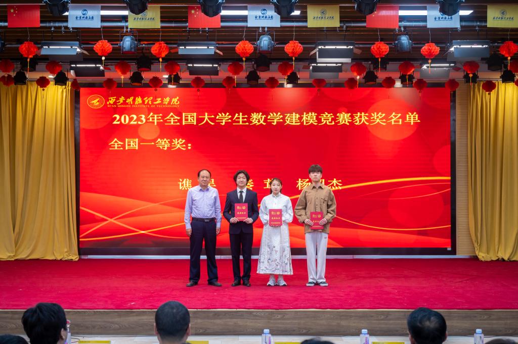 学校在2023年全国大学生数学建模竞赛中荣获全国一等奖1项、全国二等奖3项、陕西省一等奖11项及陕西省二等奖16项的优异成绩,为进一步总结经验,表彰先进,营造良好的学习氛围。2024年4月24日,ac米兰官方网站在建德楼203报告厅举行2023年全国大学生数学建模竞赛颁奖会暨参赛经验分享会。校长王志刚,党委副书记、副校长白秦川,副校长朱延波,教务处副处长文亮,各二级学院党委书记、副书记及数学教研室全体教师参加了颁奖会,颁奖会由通识教育学院副院长郑薇主持。