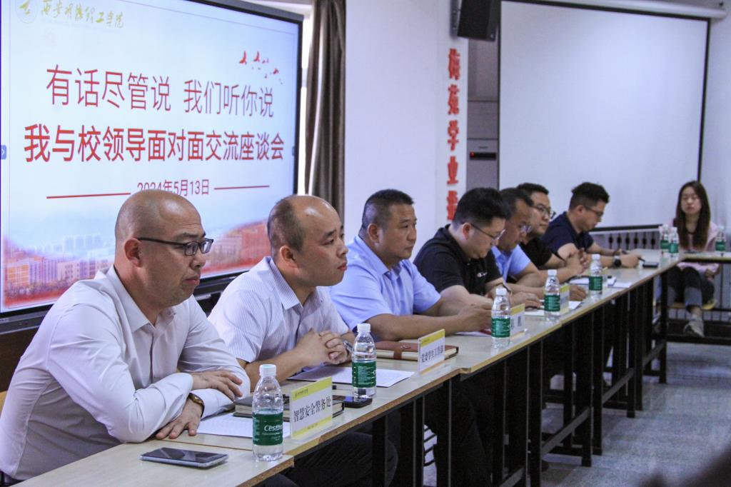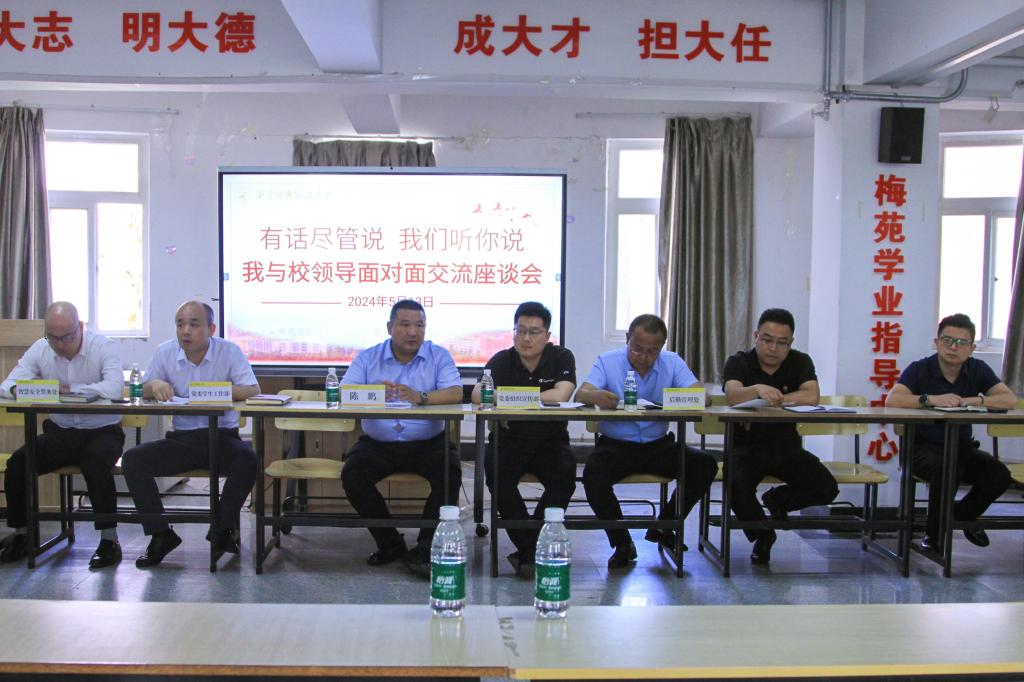 为进一步提升学校管理育人、服务育人的针对性与实效性,增强广大学生参与学校民主管理的主人翁意识,架起学校与学生常态化的沟通桥梁,倾听学生心声,解决学生问题,服务学生发展。5月13日下午,学校在“一站式”学生社区-梅苑学业指导中心召开“有话尽管说,我们听你说——我与校领导面对面”座谈会。学校副校长陈鹏出席座谈会,党委组织宣传部、党委学生工作部、后勤管理处、智慧安全警务处等单位负责人及各学院学生代表参加会议。