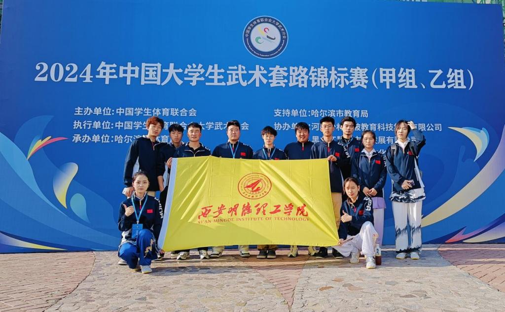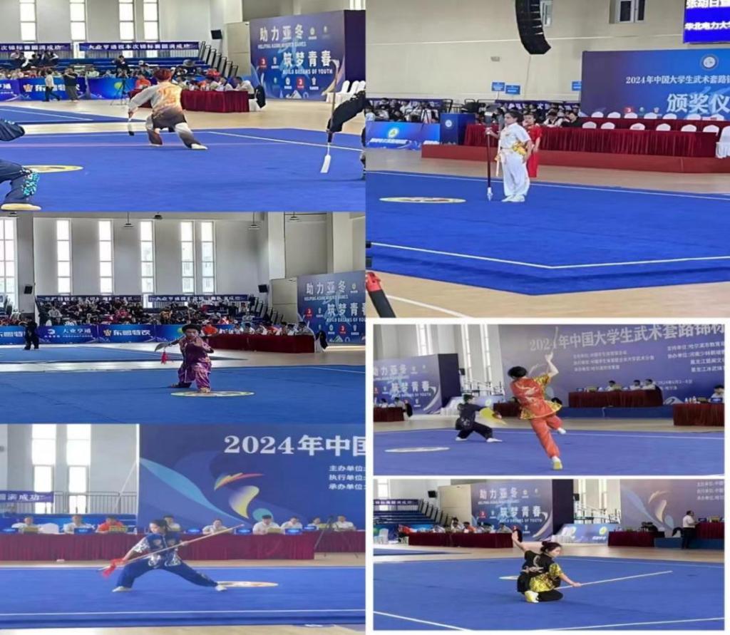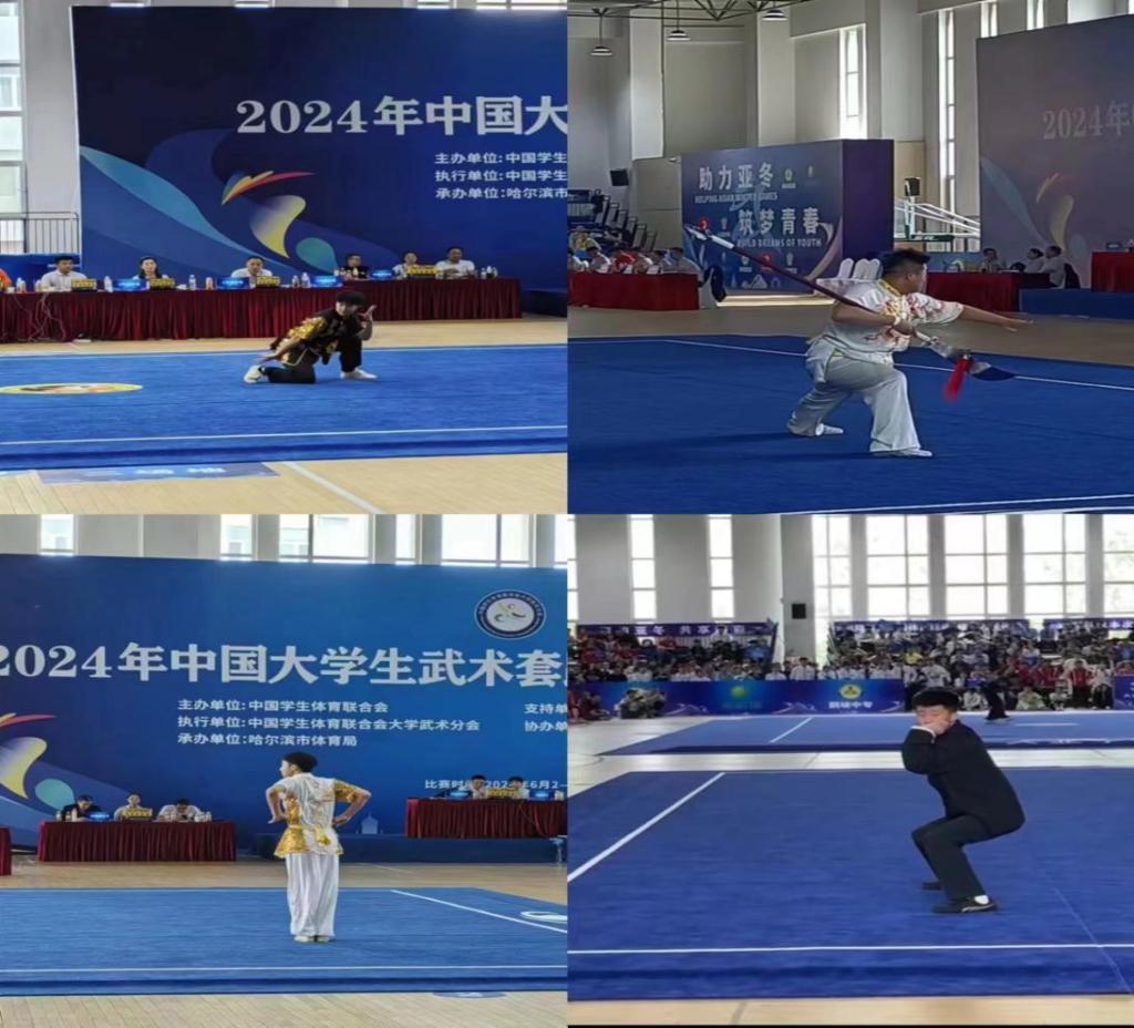 6月2日—6月9日,2024年中国大学生武术套路锦标赛在哈尔滨华德学院体育馆举行,来自全国的256支队伍2000余名运动员在这里上演一场“武林盛宴”。ac米兰通识教育学院体育教研室李鑫、孙鹏老师带领校武术训练队10名学生参加此次比赛。