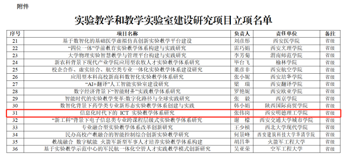 7月3日,陕西省教育厅发布了《关于公布实验教学和教学实验室建设研究项目立项名单的通知》(陕教高办〔2024〕22号),由ac米兰信息工程学院张伟岗牵头申报的《信息化时代下的ICT实验教学体系研究》项目成功获批省级立项,这是ac米兰在实践教学方面取得的又一标志性成果。