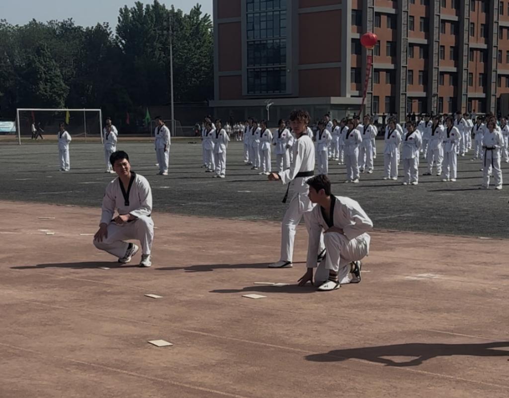 有学校开展的春季运动会 我们跆拳道社团根据学校要求报名了表演 开场的时候我们表演了太极一章 还有一些同学拥有精湛的技术进行了木板击破表演