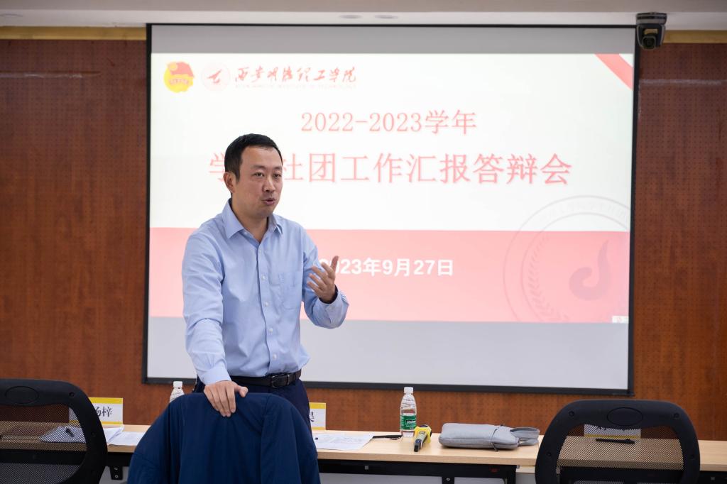 为深入学习贯彻党的二十大精神和习近平新时代中国特色社会主义思想,进一步规范学生社团管理,深化社团育人实效,促进学生社团活动健康有序进行。9月27日,校团委在明志楼311报告厅举办了2022-2023学年学生社团工作汇报答辩会。校党委副书记董昊、党委学生工作部副部长、校团委书记童杨梓、校团委副书记刘雄、乔建、各院团委书记、社团指导教师代表、各团学组织负责人参加会议。
