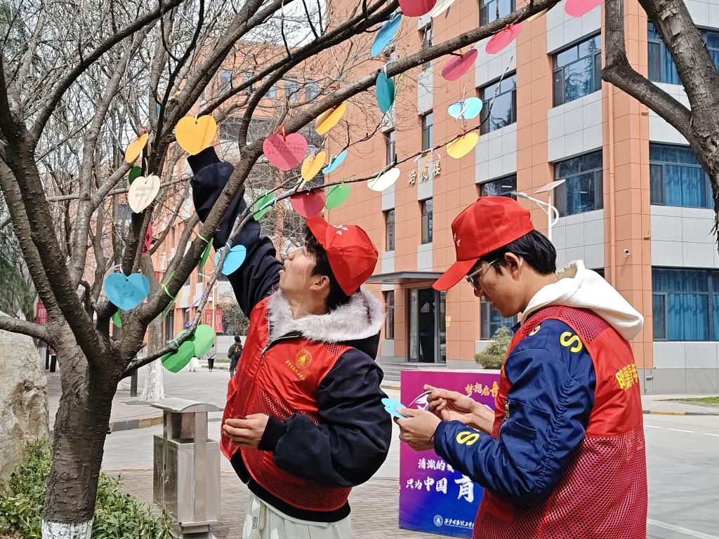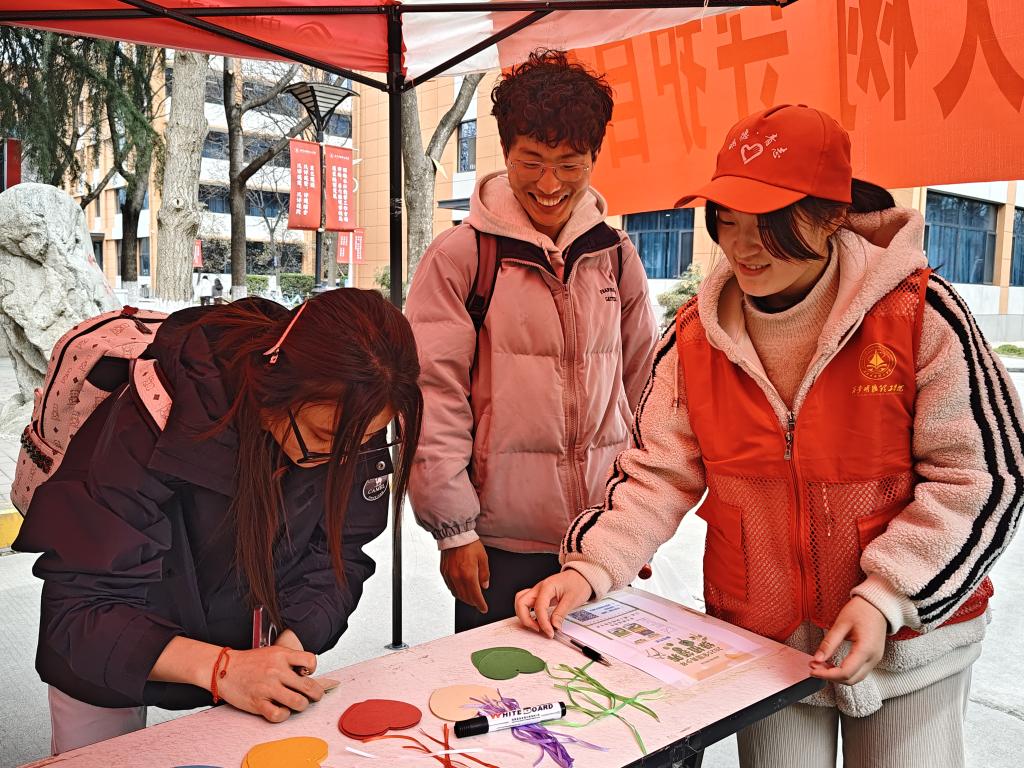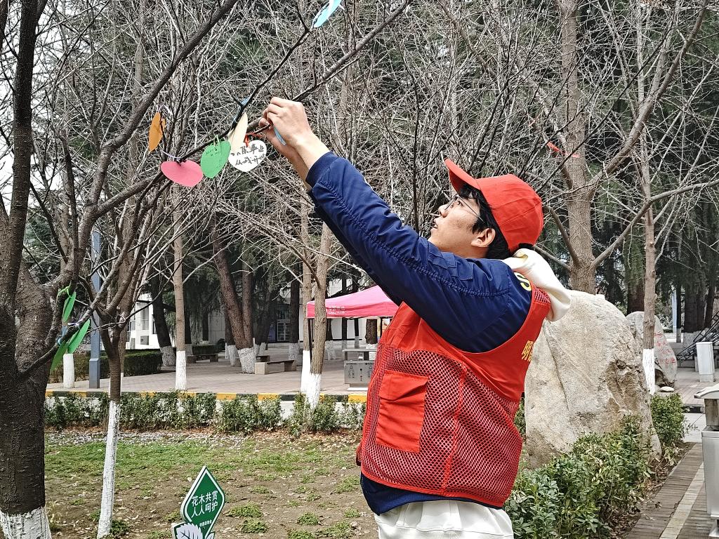 中午12点,暖阳倾洒,“寄语大树”活动在芳菲路准时拉开帷幕。活动现场,同学们的热情高涨,纷纷围聚在桌前,拿起彩笔,在精致的卡片上一笔一划地写下对大自然最诚挚的美好祝福与深切期许。有的同学写道:“愿山川常绿,万物自由生长。”微风温柔拂过,卡片随风轻摇,发出细微的簌簌声,仿佛是同学们与大自然之间的轻声对话,与周围葱郁的树木相互映衬,共同构成了校园里一道温馨而独特的风景线。大家用这样充满仪式感的方式,尽情抒发着对自然的热爱,将守护绿色家园的坚定决心传递开来。