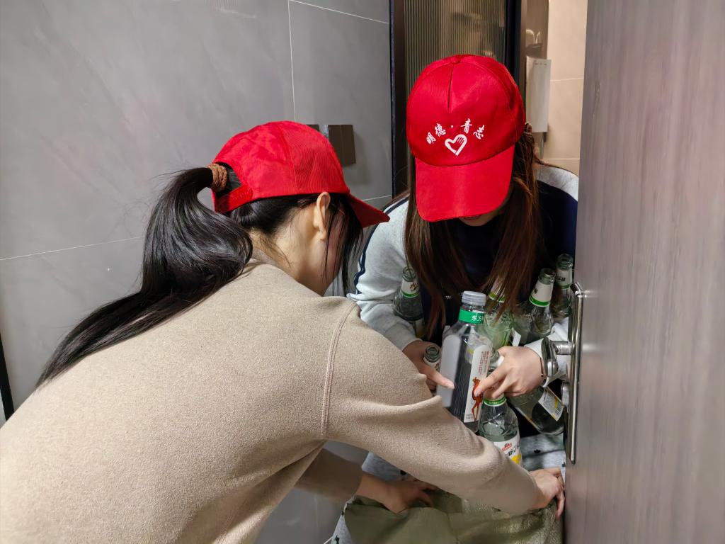 活动伊始,志愿者们头戴统一的帽子,精神饱满地在中心广场前集合,并前往同学们的宿舍楼,耐心地询问大家有没有不需要的废瓶子。他们穿梭于宿舍之间,认真搜寻着每一个角落,不放过任何一个可以回收的瓶子。