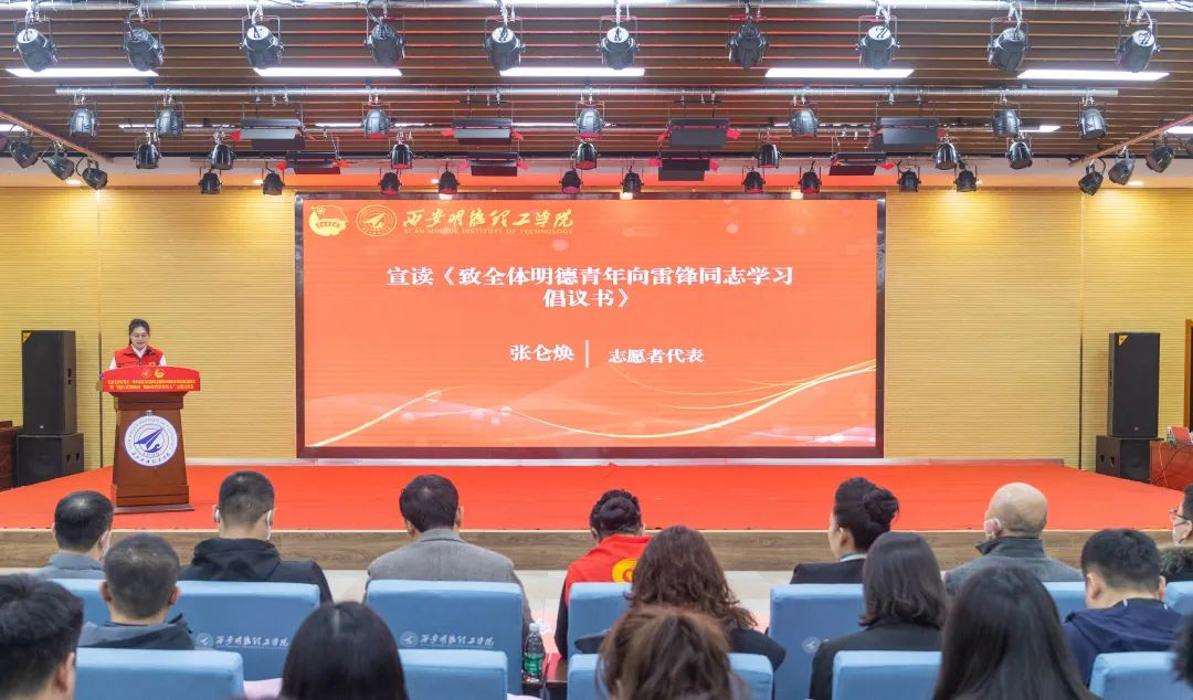 优秀青年志愿者代表张仑焕向全体明德青年发出向雷锋同志学习倡议。她倡议全体明德青年要学思贯通,深刻把握雷锋精神的时代内涵;要知行合一,应积极投身雷锋精神的生动实践,要踔厉奋发,做好新时代“钉子”精神的青年诠释。