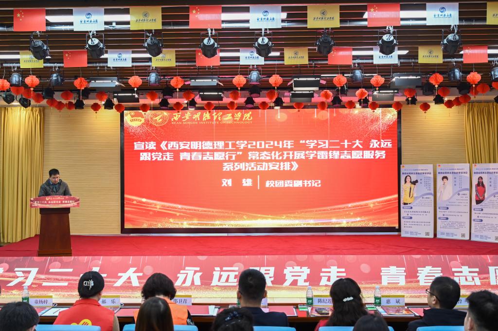 校团委副书记刘雄宣读了《西安明德理工学2024年“学习二十大 永远跟党走 青春志愿行”常态化开展学雷锋志愿服务系列活动安排》。