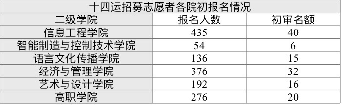 请各二级学院根据十四运志愿者招募要求进行筛选报送名单,于10月20日前将电子版汇总表和报名表打包发送至青年志愿者服务团邮箱:mdqz100@163.com,纸质版送至服务团办公室:二号实训楼411。