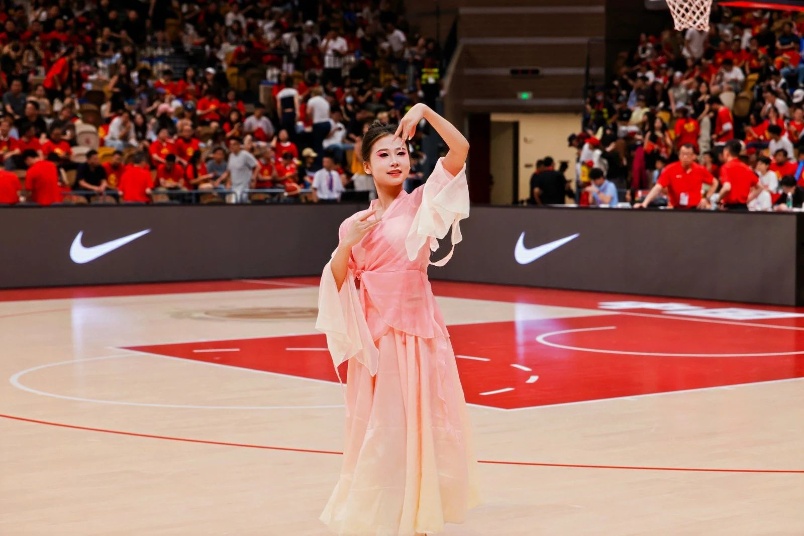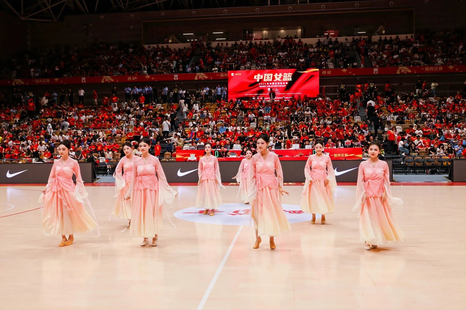 作为国际篮联认证的A级赛事,本场比赛吸引了近万名观众到场观赛。中场休息,中国女篮凭借默契配合暂时领先,但场边的紧张感仍在蔓延。此时,9名身着淡粉与月白相间舞衣的姑娘,从舞台两侧轻盈入场。