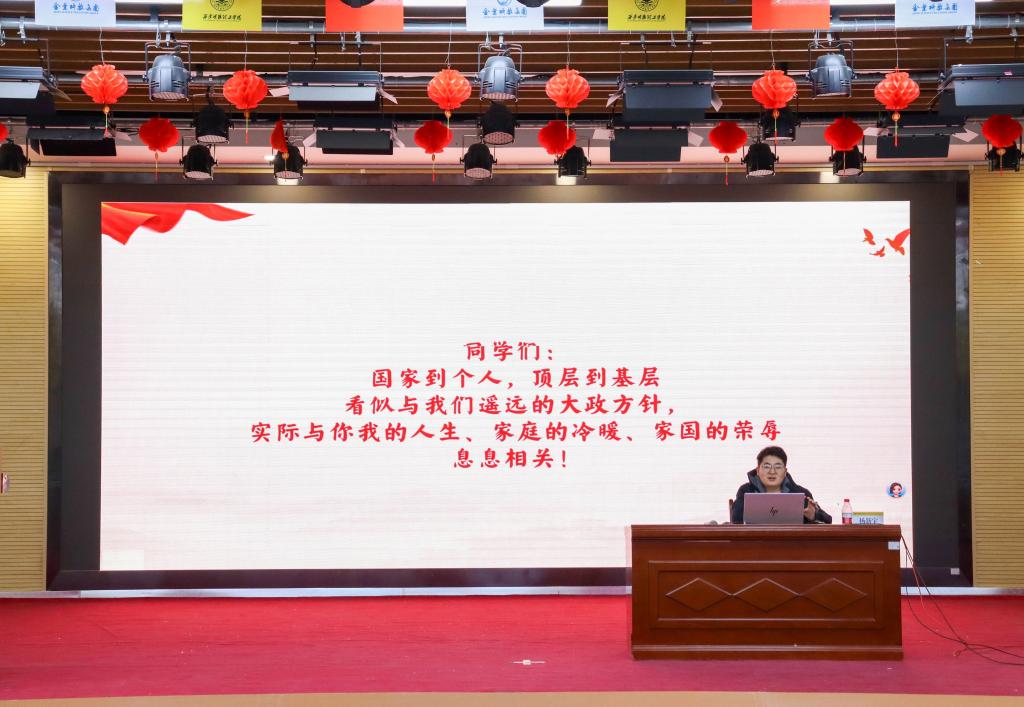 在阐述“全会对青年成长的战略指引”时,杨老师重点分析了教育、科技、人才一体化布局带来的时代机遇,阐释了现代化产业体系建设对人才素质的新要求,以及高质量发展背景下青年的使命担当。他结合大学生就业创业支持政策,鼓励同学们坚持“知行合一”,把个人发展融入国家发展大局,坚定理想信念、锤炼过硬本领、投身创新实践,努力成长为德才兼备、可堪大任的时代新人。