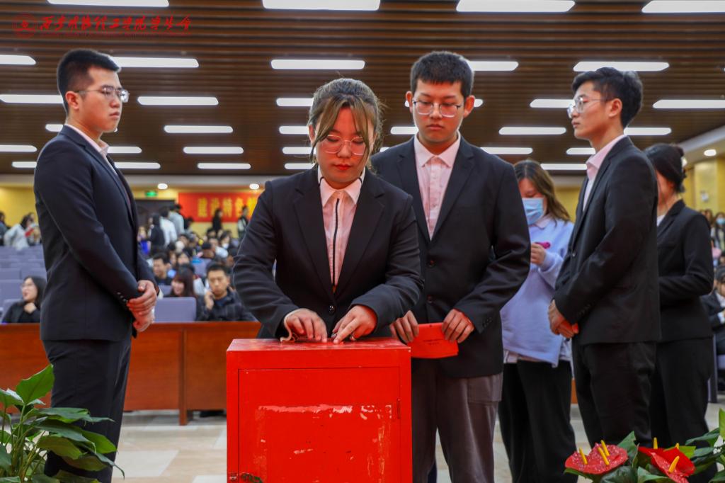 随后,参会老师为第二届第七学生干部颁发聘书。新一届学生会主席团对学生会未来的工作思路与工作方向作了汇报,鼓励同学们汇聚青春力量,书写青春华章。