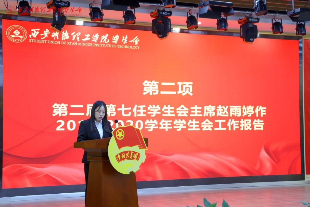 大会在庄严的国歌中拉开帷幕。首先,第二届第七任学生会主席赵雨婷向与会代表作了《不忘初心谋发展,砥砺前行创辉煌》的中期工作报告。他总结了过去一年学院学生会的工作,并对未来的工作提出了“学会创新、严谨认真、锐思进取、反思自我”的建议。