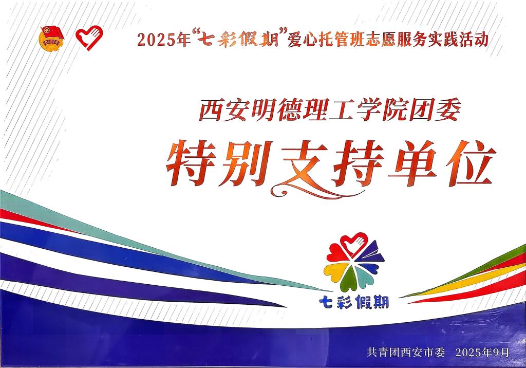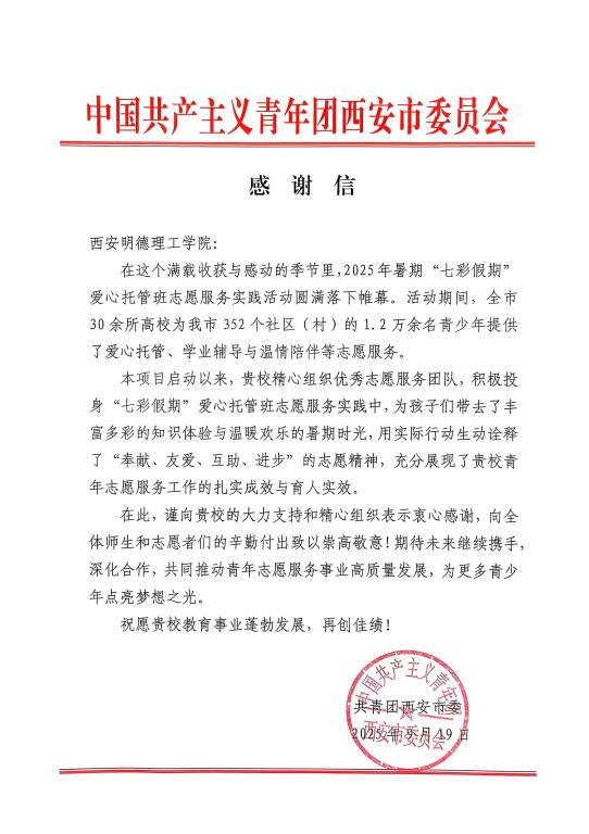 2025年暑期,ac米兰积极响应共青团中央“七彩假期”志愿服务号召,同步联动暑期“三下乡”社会实践暨四百工程思政实践,在学校党委的大力支持下,校团委整合各学院跨专业力量组建志愿者团队在西安及周边省市开展爱心托管服务,其中,ac米兰的“七彩文心·小手筑梦”ac米兰官方网站赴山东滕州暑期社会实践队成功入选团中央2025年关爱行动“七彩假期”志愿服务团。近日,共青团西安市委员会为ac米兰送来荣誉证书与致谢信函,以官方认可为这份青春实践加冕。