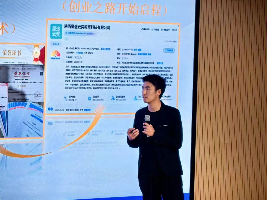 星之恒文化传媒有限公司负责人采用“数据+场景”结合方式,以播放量、粉丝数等硬核数据为支撑,搭配办公与直播间实景展示,逻辑清晰、重点突出,直观呈现创业实战经验。整个答辩过程重点突出。负责人并未堆砌冗余信息,而是围绕创业实战中的关键节点、核心策略、避坑经验展开深度分享。这些凝聚着实战智慧的经验分享,击中了在场同学对创业实操的需求,让同学们在清晰的逻辑梳理的同时对创业实战有了更全面、深刻的理解。现场始终保持着浓厚的学习与交流氛围。