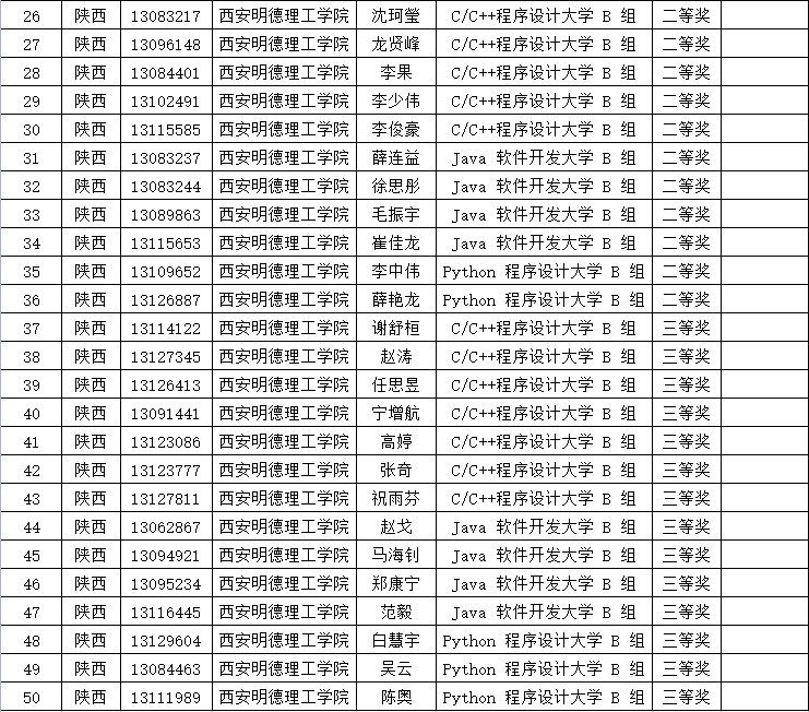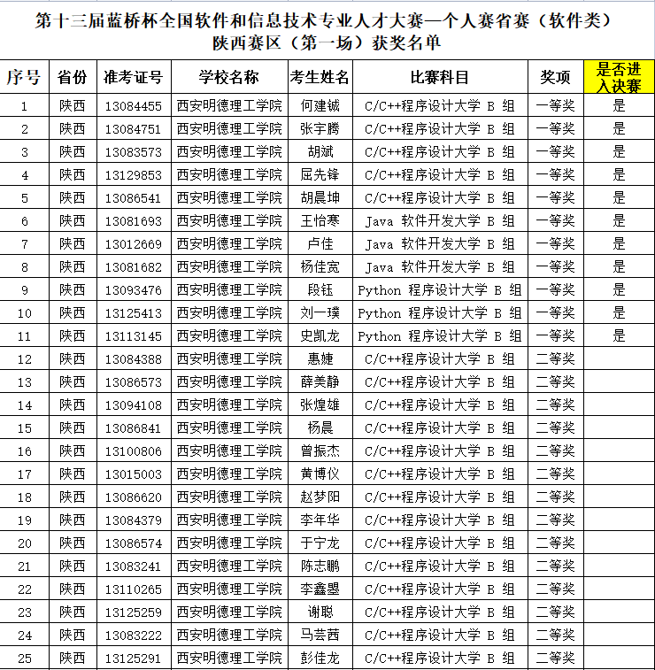 2022年4月28日,第十三届蓝桥杯大赛—个人赛省赛(软件类)陕西赛区(第一场)获奖名单揭晓,ac米兰何建铖等11名同学获得一等奖,将参加第十三届蓝桥杯大赛全国总决赛。获奖总人数位列全省高校第五位。马芸茜等25名同学获得二等奖、吴云等14名同学获得三等奖。获奖数量位列全省高校前列。