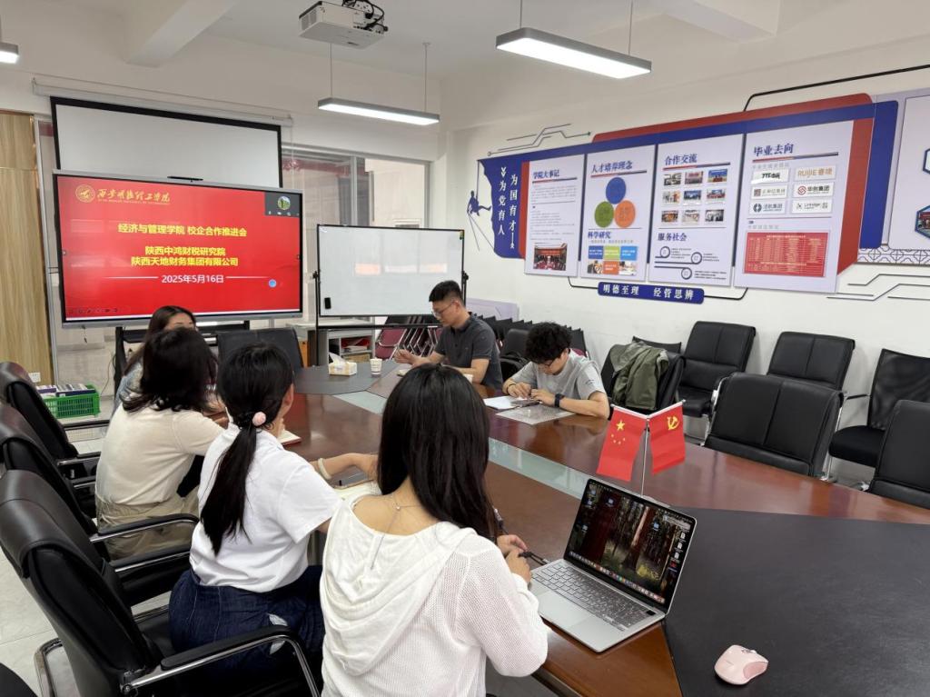 为深化校企合作,拓宽毕业生就业渠道,精准推进实习就业工作,5月15日,经济与管理学院同陕西天地财务集团有限公司在明志楼北606洽谈学生实习实训事宜。金融产业学院副院长刘敏、会计学专业负责人孙琳、教师张瑞芝、财务管理专业教师梁静,陕西中鸿财税研究院及陕西天地财务集团有限公司代表共同参加洽谈。洽谈会由刘敏主持。