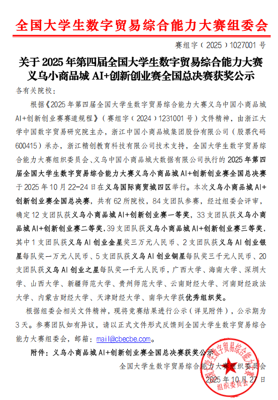 10月23日,由浙江大学中国数字贸易研究院与义乌中国小商品城大数据公司联合举办的第四届全国大学生数字贸易综合能力大赛在浙江义乌举行,经济与管理学院参赛代表队喜获二等奖。