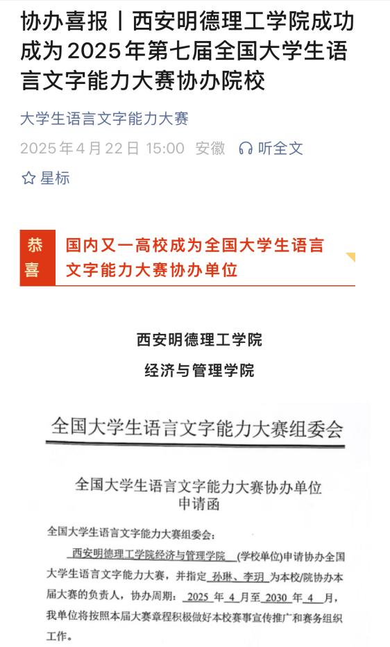 ac米兰官方网站经济与管理学院正式获准成为全国大学生语言文字能力大赛协办院校,协办周期为2025年4月至2030年4月。这一成果标志着学校在推动国家通用语言文字教育、服务学生综合素质发展方面迈出坚实一步,也是学校持续深化教育教学改革、落实立德树人根本任务的重要体现。