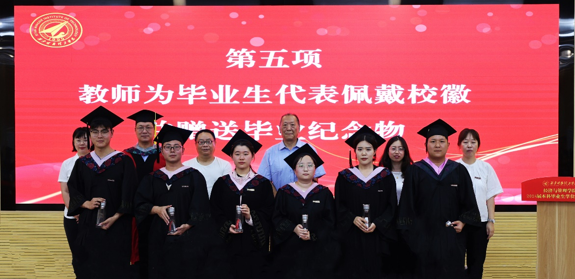 校院领导和教师代表为毕业生代表佩戴校徽并赠送学院为毕业生定制的水杯纪念物,希望毕业生饮水思源,懂得感恩回报。