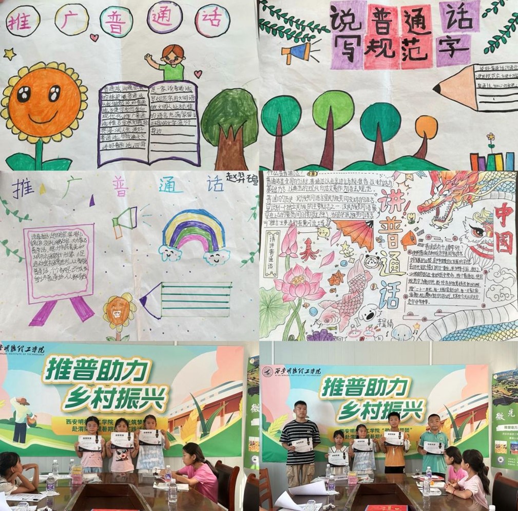 为做好儿童普通话推广普及,激发儿童对普通话的学习兴趣,实践队组织当地6-12岁小学生开展了趣味普通话课堂。实践队成员车晓竟、杨婉彤通过儿童喜闻乐见的形式,讲解了中国文字的创造和发展、中华民族各民族的语言特点、风俗文化,日常普通话使用、发音、汉字书写等知识,带领孩子们进行了诗词飞花令、绕口令比赛、你画我猜、听词举手大挑战等趣味活动;组织儿童们进行普通话手抄报的制作,一幅幅充满童真童趣而又感情真挚的手抄报,不仅表现出孩子们内心向往的生活,也表达着孩子们对普通话的认识和学习热情。在孩子们认真学习的目光和被肯定表扬后的笑脸中,实践队更加深刻理解到社会实践的意义,理解到“推普助力乡村振兴”不是一句简单的口号,而是通过用心的实践去发现,去帮助一群人,点亮他们的梦想,用自己的知识和热情真切地参与到乡村发展中,赋能乡村振兴。