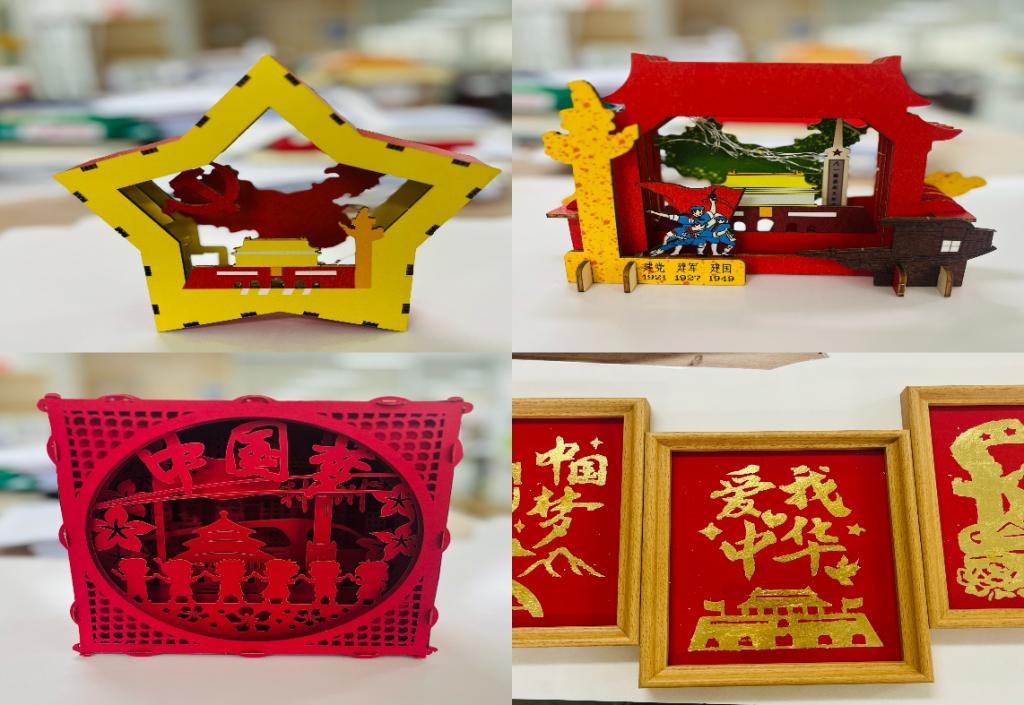 活动将理论学习与沉浸式体验相结合。与会同学集中学习了伟大建党精神的科学内涵,通过导学与研讨,大家共同重温红船精神、井冈山精神、长征精神、延安精神等精神谱系内容,领悟其时代内涵,筑牢思想根基。在沉浸式手工实践环节,同学们分组开展“匠心工坊”,通过亲手制作金箔画、立体剪纸和拼接摆件,将对党的深情厚谊融入指尖艺术。金箔画制作中,大家精心设计图案,小心翼翼覆盖金箔,创作出熠熠生辉的党徽主题作品;立体剪纸环节,巧手翻飞、红纸生辉,细心描摹裁剪出党徽、红船、天安门等立体生动的图案。一刀一刻的精工细作,既是对传统技艺的体验,更是对新时代“匠心”精神的生动诠释。活动中,同学们热情高涨,团结协作,共同完成了富有创意的作品。