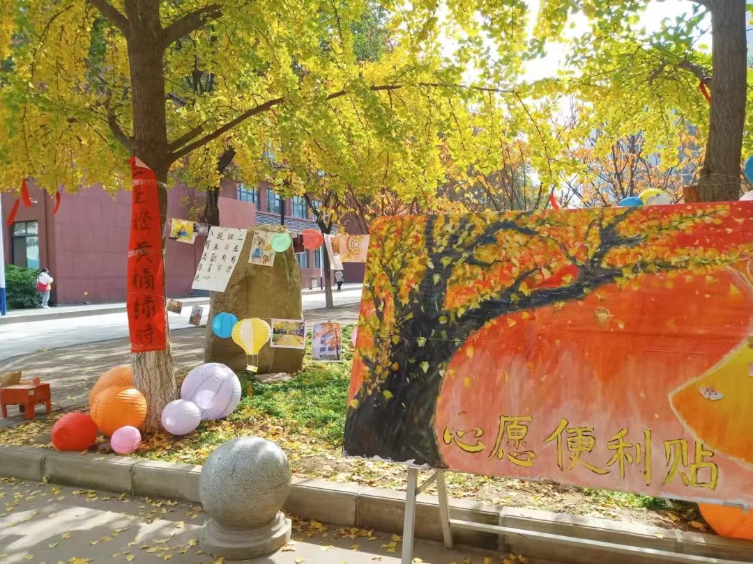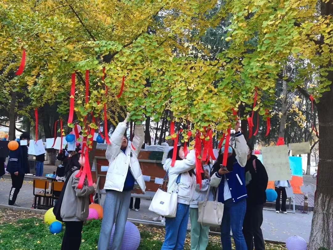 十一月中旬的寒冷天气,也丝毫没能影响明德学子们参与活动的热情。落叶为青春伴舞,银杏为未来铺路。同学们在“千手之约”活动中留下手印,在“心愿便利贴”上写下愿望,而“红丝绸”上,带着各种各样的美好祝愿。