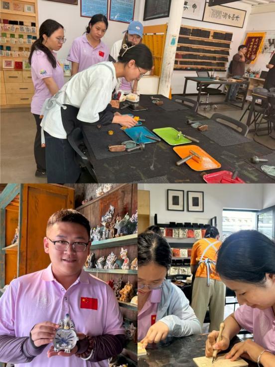 通过非遗体验,同学们对“三道茶”的历史渊源、茶艺次序、人文价值及其中蕴藏的尊重、善意与祝福有了深入了解。在璞真博物馆工作人员、匠志集大理民艺中心省级甲马非遗文化传承人张仁华、瓦猫文化工作人员的指导下,团队成员先后创作出自己的第一件扎染作品、雕刻出自己的第一幅甲马版画并进行拓印、捏出自己的第一个瓦猫作品。通过对非遗文化技艺体验,团队成员对非遗文化技艺背后的价值内核和民族底蕴有了更为充分的理解。
