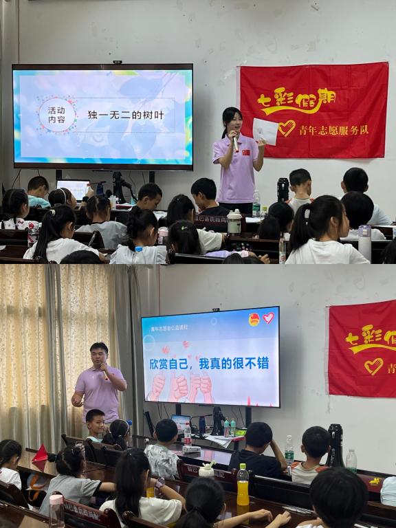 青少年时期是人生的“拔节孕穗期”,实践队精心策划了一场关爱农村留守儿童身心健康的趣味教育活动,为社区的孩子们带去了知识与欢乐的双重盛宴。针对不同年级学生的心理发展特点,活动围绕“独一无二的树叶”“房树人”“我的情绪我做主”等心理团辅展开。队员运用互动游戏、绘画表达等形式,引导孩子们敞开心扉,表达情感与想法。“独一无二的树叶”环节中,孩子们通过寻找、观察和描绘树叶,认识到个体独特性,增强自我认同与自信;“房树人” 绘画让孩子们用画笔勾勒内心的家园、梦想与情绪;“我的情绪我做主”通过情景模拟和角色扮演,教会孩子识别、管理情绪,学习用健康方式排解负面情感。活动以互动为主、教学为辅,鼓励孩子们在轻松氛围中倾诉烦恼。