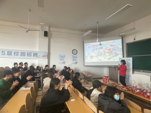 西安顶益食品有限公司人力资源部主管李颜从品牌起源、发展历程、招聘需求、薪酬福利、发展空间等方面介绍了企业概况,通过答题互动、趣味活动等方式进一步增强了宣讲现场的氛围感,加强了毕业生对用人单位的了解。宣讲结束后,毕业生纷纷对岗位应聘方式进行咨询,在官方指定投递渠道进行简历投递。李颜对毕业生关注的求职招聘问题进行现场答疑,气氛热烈融洽。