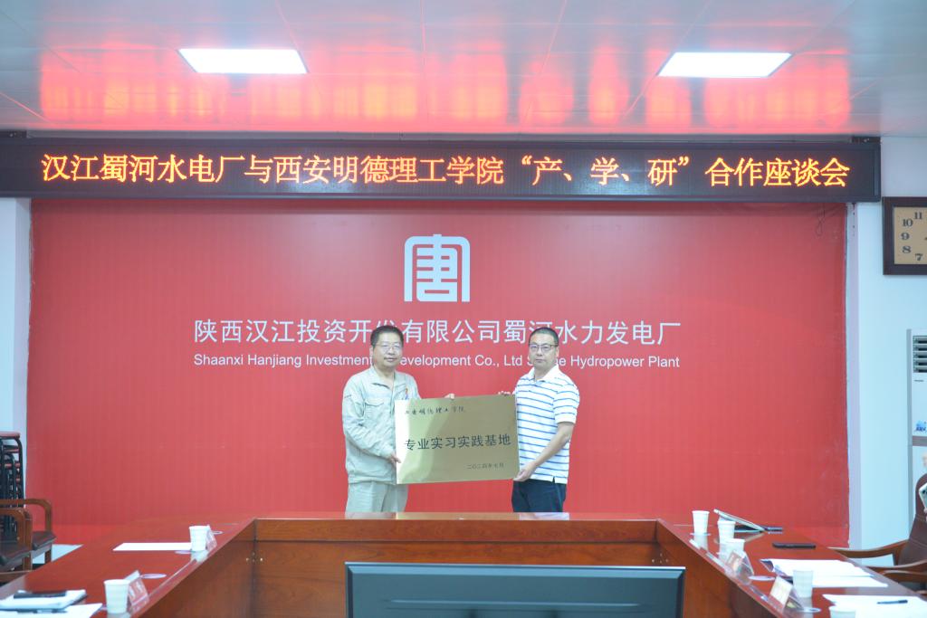 为深化校企合作,促进产教融合,推进学科建设与专业发展。2024年7月5日,智能制造与控制技术学院与大唐电力汉江投资开发有限公司蜀河水电厂举行产、学、研合作座谈会暨专业实习实践基地授牌仪式。汉江公司副总经理、蜀河水电厂厂长董宁、水电厂综合部负责人梁琦、人事主管李松,学校副校长朱延波、学院办公室主任赵婷、电气工程及其自动化专业负责人刘晓春、机器人工程专业负责人王卫军以及实习学生代表出席授牌仪式。