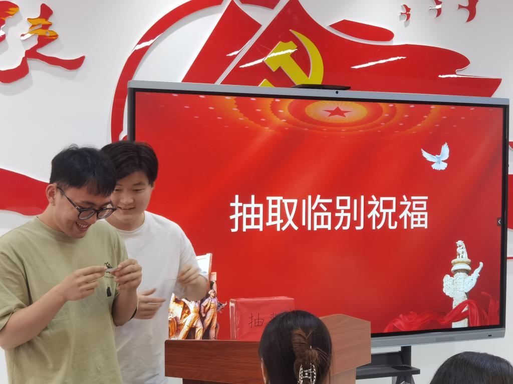 “未来可期,人生值得”、“所有的坚持和孤独都会发光”、“过往皆为序章、将来皆为可盼”……为祝福毕业生党员们顺利毕业,学生第一党支部将200多份祝福卡放入“抽奖箱”中,由毕业生党员抽取支部赠与的临别祝福卡。同时毕业生党员们也写下了对母校对人生的美好祝福,支部予以留存珍藏。
