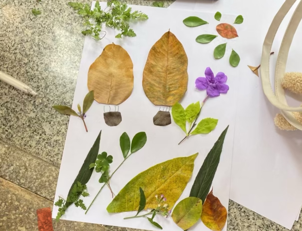 “一叶传情”游戏活动现场,闫梦娜为每位参与者准备了一张洁白的纸张和几片形状各异的树叶。在老师的引导下,同学们开始尝试用树叶作为“画笔”,在白纸上自由挥洒,创作出一幅幅独特的“叶画”。