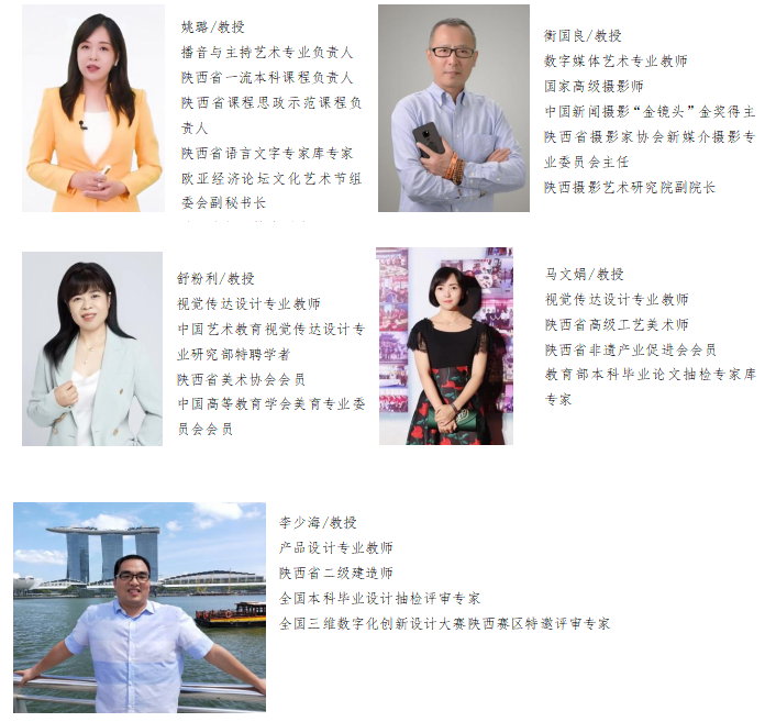 学院高度重视师资队伍建设,立足长远,统筹规划,从985/211(双一流)、海外名校和知名企业积极引进高职称、高学历、双师双能型优秀人才,已形成名师领衔、中青年为骨干、专兼结合、结构合理、素质优良的教学团队。教学院现有专职教师86人,专任兼职教师29人,其中教育部专业教学指导委员会副主任1人,陕西省教学名师2人,陕西省文化艺术领军人才1人,中国工艺美术大师1人,陕西省工艺美术大师2人,国家高级摄影师6人,陕西省语言文字专家2人。高级职称教师20余人,硕士学位及以上教师比例达到91.91%。聘请国家首批非物质文化遗产代表性传承人邰立平先生为客座教授、聘请著名摄影家和摄影教育家柏雨果教授为学院大师工作室特聘教授,并聘请10余位来自各大高校、企业、行业的学者专家来院任教。
