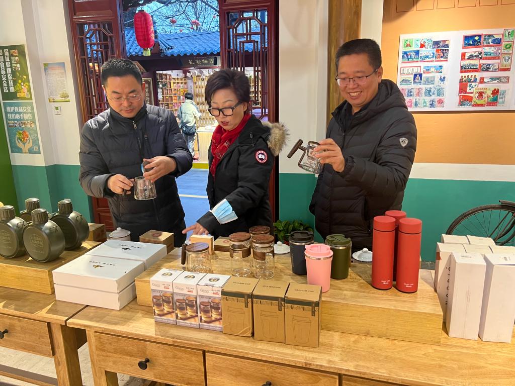 随后段晓玉总经理带领学校一行人参观了永兴坊和人民日报联名打造的人民日报文创体验中心。人民日报文创是利用自身的媒介传播优势和强大的社会公信力与永兴坊非遗文化品牌IP的全国影响力、优秀传统文化的创新再造能力相结合,一起促进非遗文化创意品牌的跨界融合,让传统品牌获取新的生命力。也为学院培养文创方面的人才提供新思路。