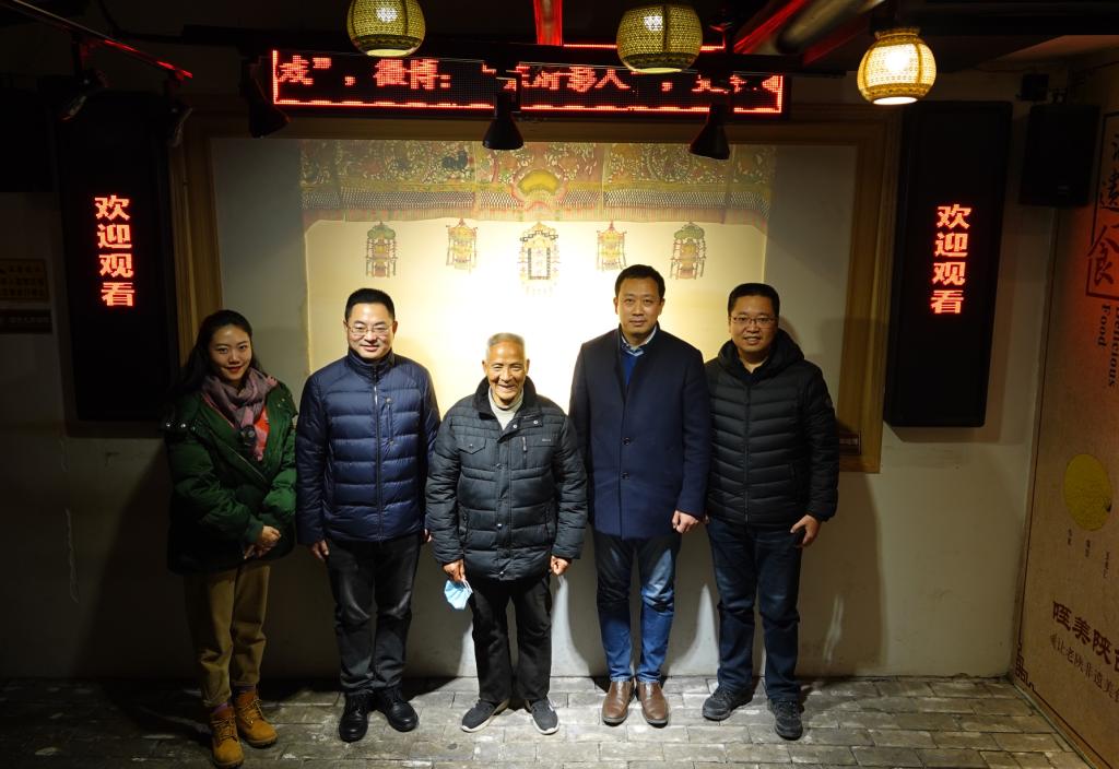 学校一行人员首先拜访了国家级非遗华县皮影魏氏皮影社班主魏稳柱。华县皮影魏氏皮影社成立于1970年,现由5位均龄70岁的老艺人和1位23岁的青年演员组成。现班社在西安市永兴坊日常化驻演,每日演出8场,累计演出场次已达上万余场。为全国各地至全球多个国家友人展示表演。此次有幸观看了魏班主表演的《刀劈韩天化》,精彩纷呈的皮影表扬让人不禁拍手叫绝。