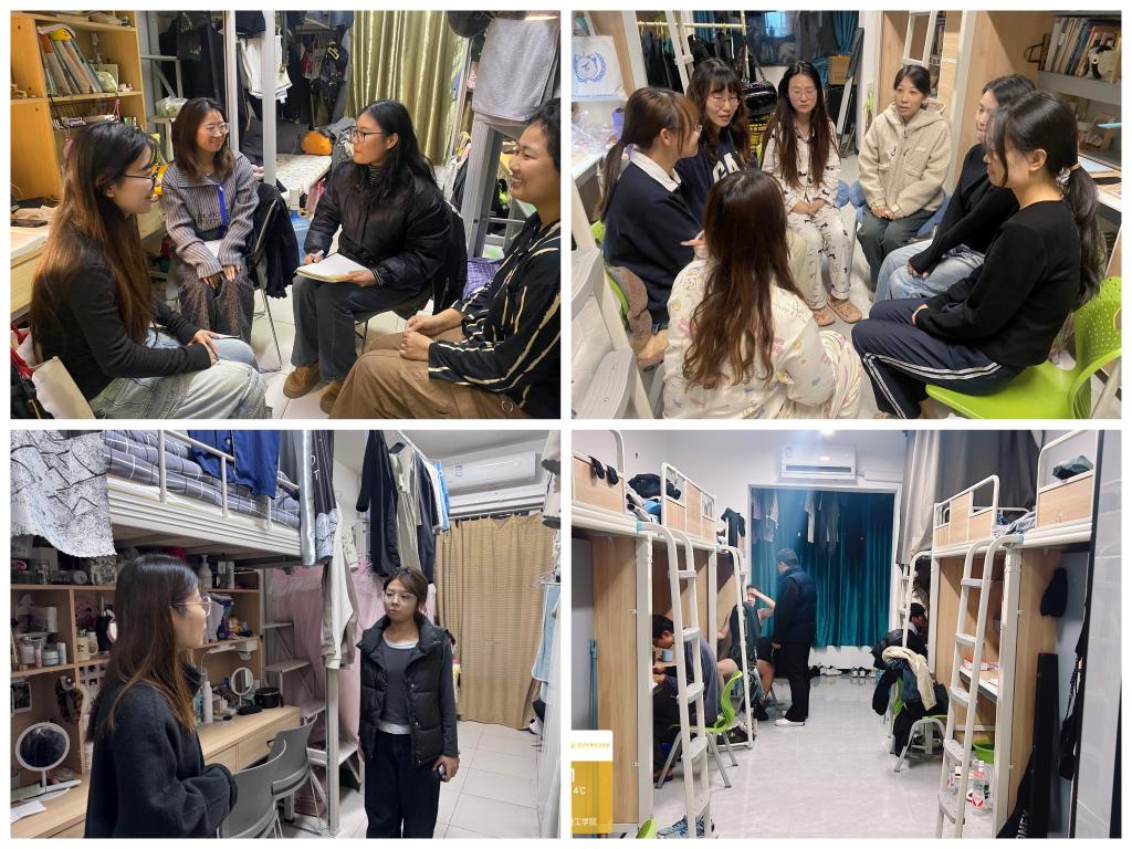 辅导员进宿舍,采取针对性走访和随机走访相融合的方式,其中每周至少随机走访学生宿舍一次。深入学生宿舍,辅导员能够全面细致排查安全隐患,更精确地把握学生的思想动态和心理需求,进而有针对性地进行引导与教育工作。辅导员细致询问学生关于生活学习、人际交往、未来发展等方面的情况,认真倾听每位同学的声音,并针对学生在学习生活中存在的问题给予耐心的解答和关怀,让学生们感受到了学校的温暖,也让同学们更加坚定了自己迎接各种挑战的信心和决心。进宿舍是精准思政的关键一环,切实打通了思想政治工作的“最后一公里”。