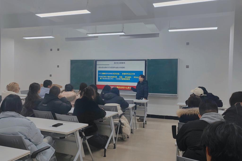 班会上,各辅导员老师围绕“文明考风,诚信考试”主题,重点解读了学校考试纪律条款,提醒同学们在期末考试期间要时刻牢记考试纪律,遵守考试规定。面对考试,存有取得优异成绩的想法无可厚非,然而通过“走捷径”的手段获得不属于自己的成绩却断不可取,同学们要有自我约束力,端正考风考纪,培养自己的诚信意识。同时,老师们还特别指出了考试违纪的后果,让在场的每一位同学深刻意识到不诚信行为的严重后果,起到了一定的警示作用。