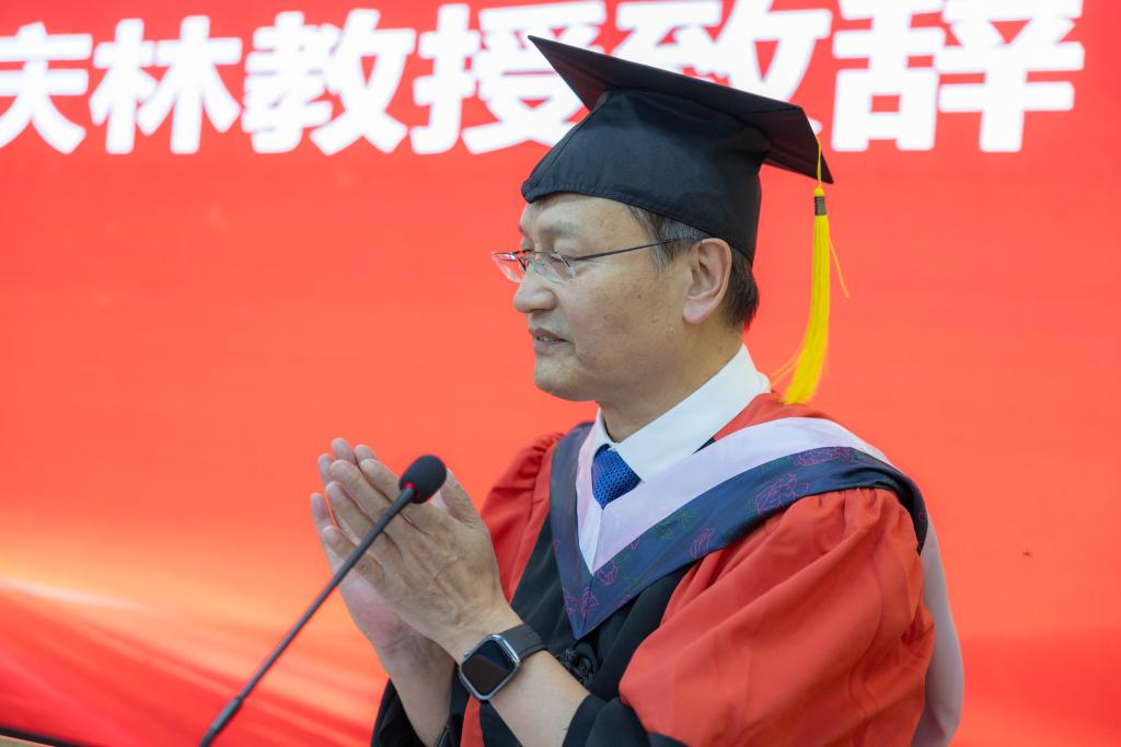 在师生的热烈掌声中,院长马庆林代表学院致辞,向全体毕业生表达了最热烈的祝贺和最真挚的祝福。他表示,寒来暑往、春华秋实,同学们在学院用热爱点燃梦想、用奋斗谱写青春华章,拨节孕穗、蜕变成长。在世界百年未有之大变局加速演进的时代背景下,语传学子要自信自立自强,树追求卓越之志。要在实现中华民族伟大复兴的征程中找准人生定位,以自信的姿态拥抱时代,以自强的精神开拓进取,以自立的担当勇毅前行。他希望语传学子们在这个伟大时代,肩负强国使命,牢记“明德、亲民、至善”校训,涵养胸怀、放大格局,勇担责任、锤炼能力,饮水思源、心怀感恩,在贡献社会中增长才干,在迎接挑战中磨砺意志。