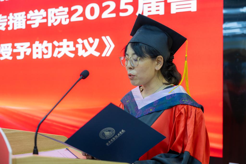 伴随着庄严的国歌,毕业典礼正式拉开帷幕。学院英语专业负责人霍小静宣读了《ac米兰官方网站关于语言文化传播学院2025届普通高等教育本科毕业生学士学位授予的决议》。她向圆满完成学业的毕业生们表示热烈的祝贺,并对他们在校期间的努力和付出给予了充分的肯定。