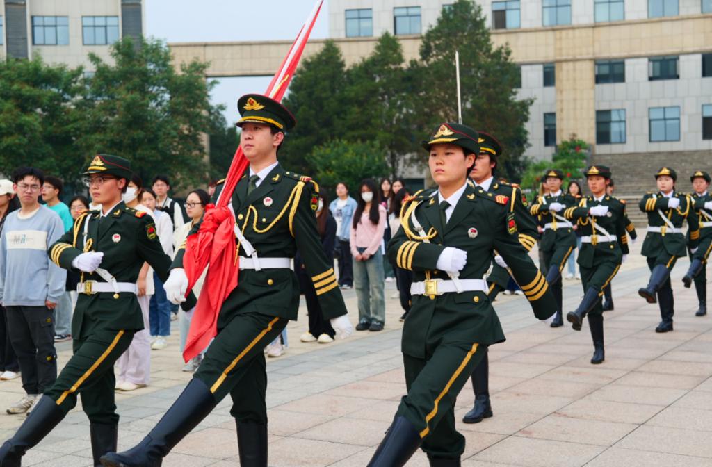 升旗仪式伊始,国旗护卫队步伐铿锵,伴随着雄壮的《义勇军进行曲》,鲜艳的五星红旗冉冉升起。全体师生肃立,目光注视着缓缓升起的国旗,表达了对祖国的无限热爱。
