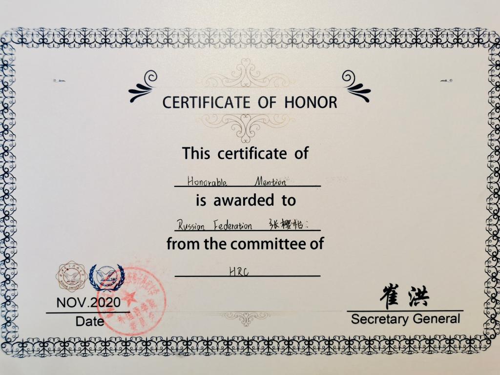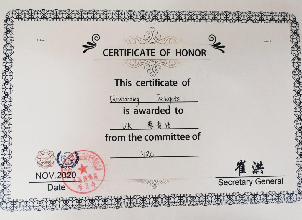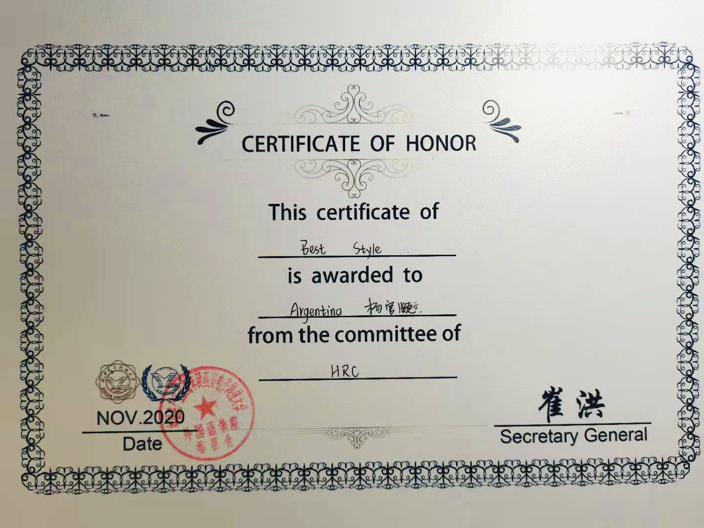 2020年11月13日至11月15日,ac米兰模拟联合国团队共派出七名代表参西安电子科技大学第十一届模拟联合国大会,斩获个人奖三项,分别是最佳风格奖(Best Style)——杨官凝,杰出代表奖(Outstanding Delegate)——蔡青清,以及荣誉提名奖(Honorable Mention)——张樱怡。