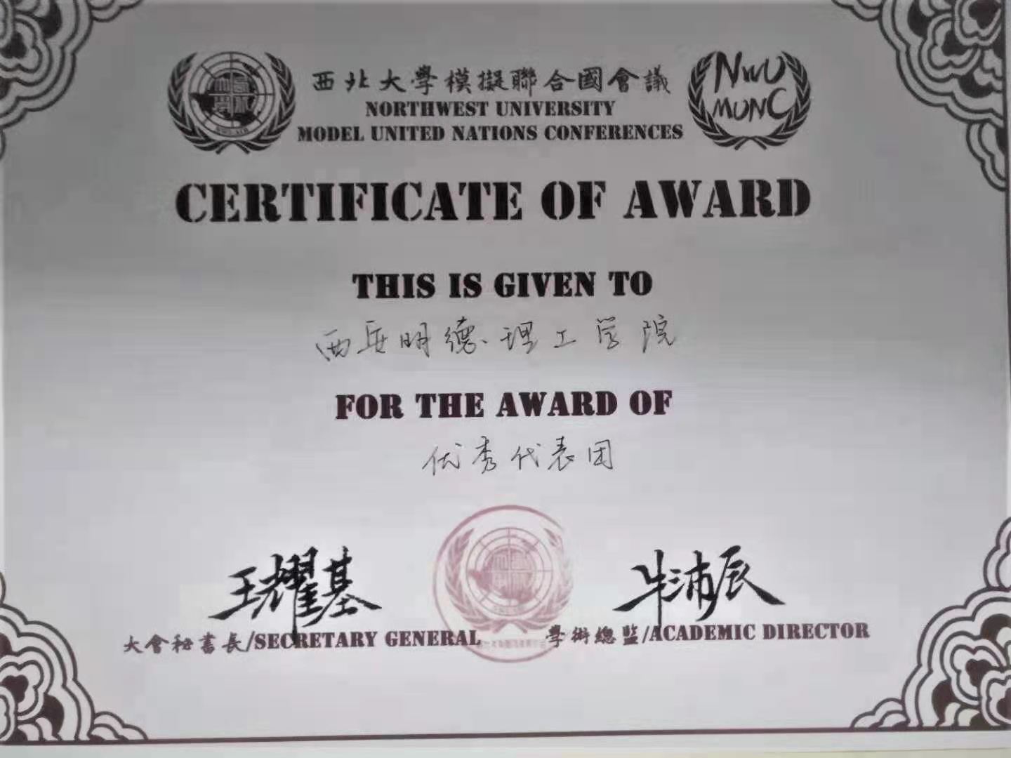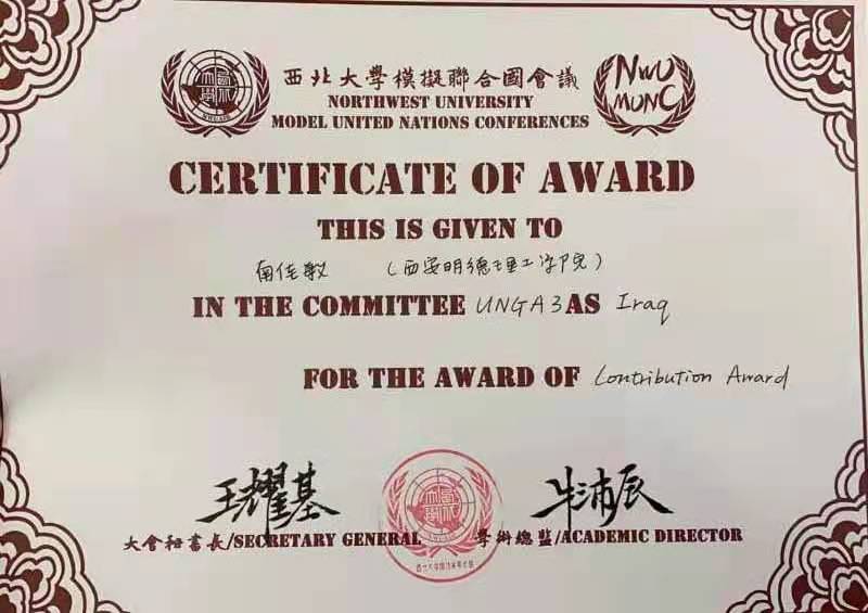 2020年12月4日至6日,ac米兰模拟联合国团队共派6名代表和3名观察员参加西北大学第八届冬季模拟联合国大会,表现出色,荣获优秀代表团奖一项,个人最佳贡献奖(Contribution Award)一项。