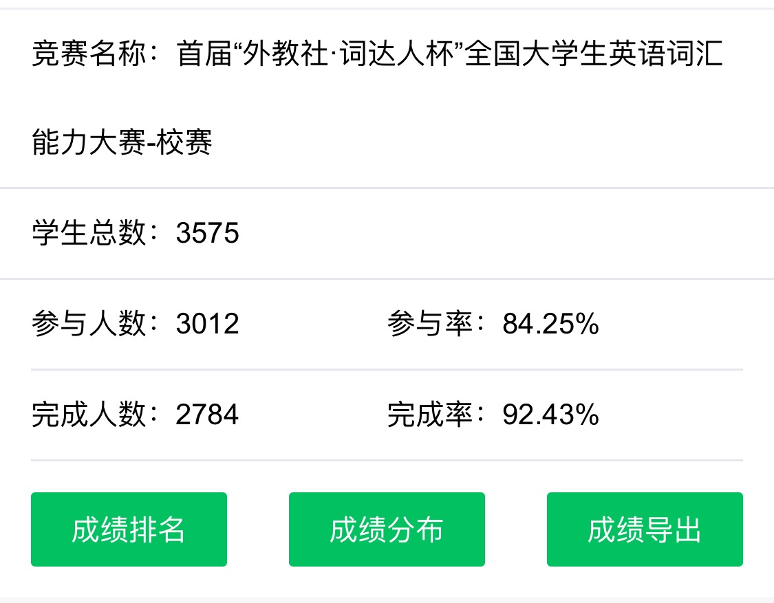 首届 “外教社·词达人杯”全国大学生英语词汇能力大赛校赛圆满拉下帷幕。ac米兰官方网站3575名学生于4月27日晚7点云端竞技,通过“词达人”微信公众号平台,进入赛事通道参与即时竞赛。直至晚8点,ac米兰共2784名同学完成初赛阶段比拼,完成率高达92.43%。
