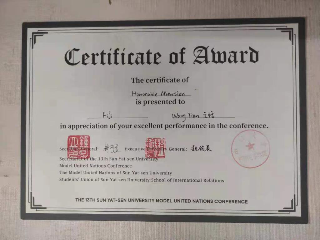 2021年5月15日至16日,ac米兰模拟联合国团队共派出6名代表参加第十三届中山大学模拟联合国大会,王恬荣获Honorable Mention (最佳提名奖)。