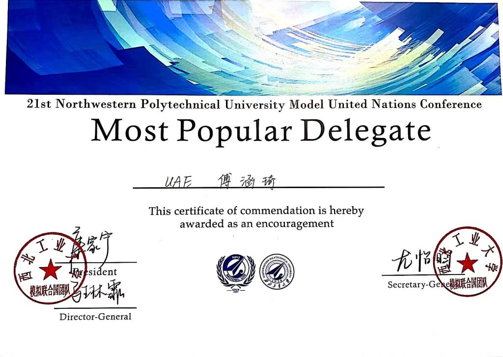 傅涵琦:我非常荣幸能够参加这次西工大模拟联合国大会,也很幸运地拿到了“Most Popular Delegate”这个奖项。这次的经历于我收获很大意义也很大,首先这次拿奖的经历让我更加地坚信:“努力是一定会有回报的”。这句老生常谈的话,每一个有此经历的人都会有更深的感受。在我们向上的道路上,会失落,会迷惘,我们需要一些来自外部的肯定,让自己更加坚信选择的路是正确的。当然获奖只是一方面,更多的收获来自于参会本身。参会的过程充满挑战,从调研资料到上会,会遇到分歧,会感觉茫然,会对自己产生怀疑,但就像电影《无问西东》里的那句话:“只问自由,只问盛放,只问深情,只问初心,只问勇敢,无问西东”,坚持下去,矛盾终会化解,问题终会解决。我告诉自己要像一只爬葡萄树的蜗牛,虽然很慢,但他走过的路,在阳光的照射下,会发出亮晶晶的闪光。