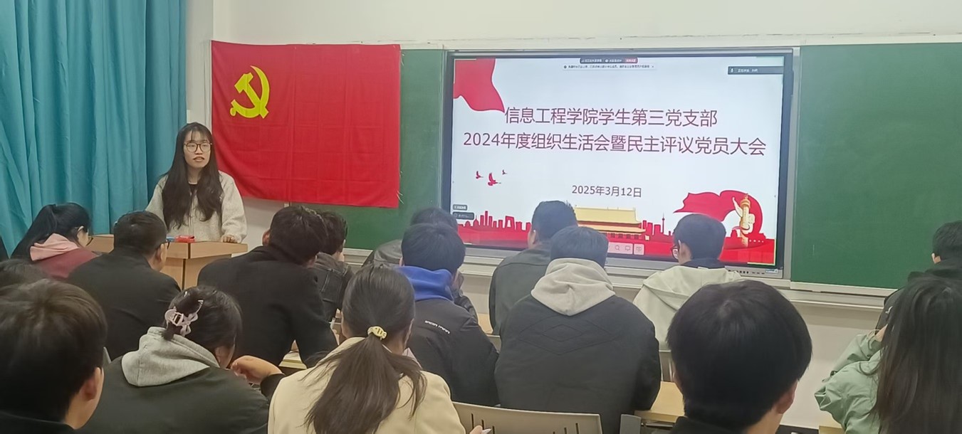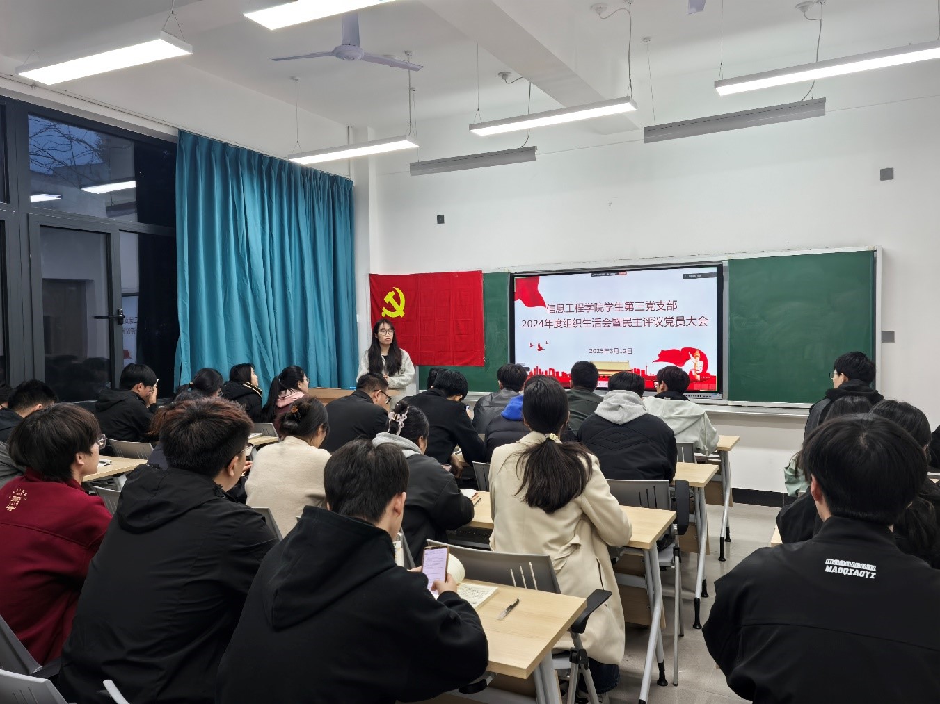 为严格落实党的组织生活制度,增强基层党组织活力,提升学生党员党性修养和政治素质,3月12日,信息工程学院学生第三党支部在培德楼110教室召开2024年度组织生活会暨民主评议党员大会。会议由支部书记李娜主持,支部全体党员参加。