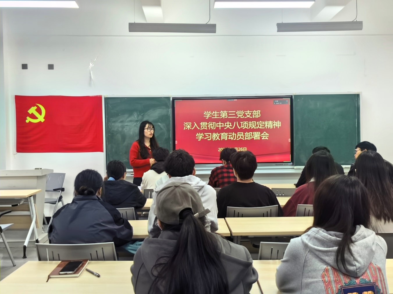 3月26日,学生第三党支部在培德楼109教室召开深入贯彻中央八项规定精神学习教育动员部署会。会议由支部书记李娜主持。