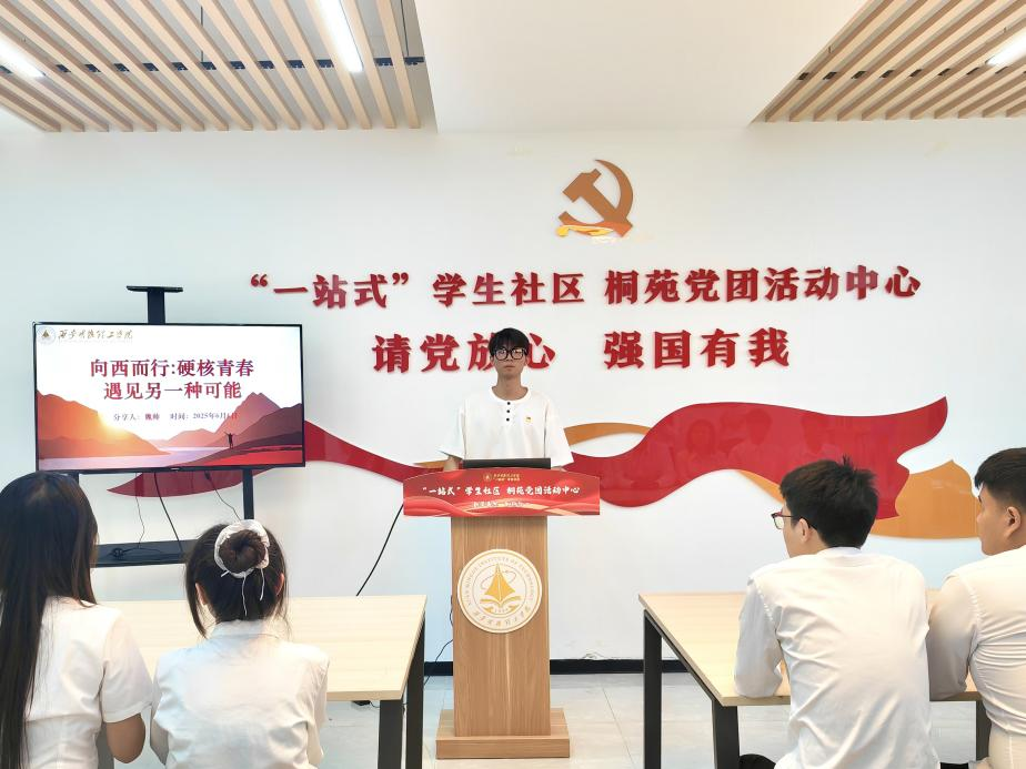魏帅同志作“向西而行:硬核青春遇见另一种可能”西部计划分享。他讲述了报名参加大学生志愿服务西部计划的初衷,他渴望将个人理想融入国家发展大局,要到祖国最需要的地方去,用青春和汗水书写无愧于时代的人生篇章,用实际行动践行共产党员的使命担当。