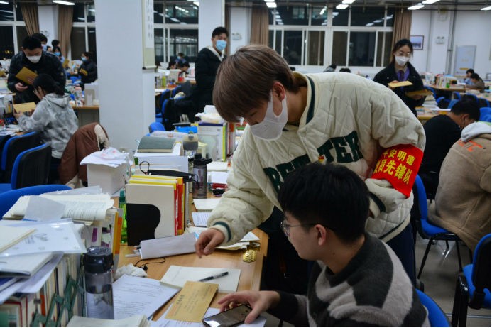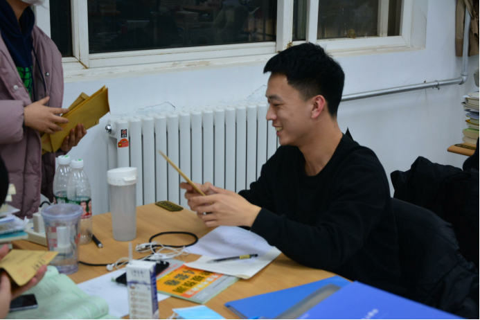 我们的"党员先锋队"志愿者来到终南书院亲手将爱心信封送到了正在复习收官阶段考研学子的手上,这一封封信给考研学子带来了冬日里的温暖,提醒考研的学子在紧张忙碌的复习过程中要切记做好防疫措施,照顾好自己。教室里的同学们接到信封纷纷表示感谢,温暖的笑容了感染着我们党支部的每一位同志。