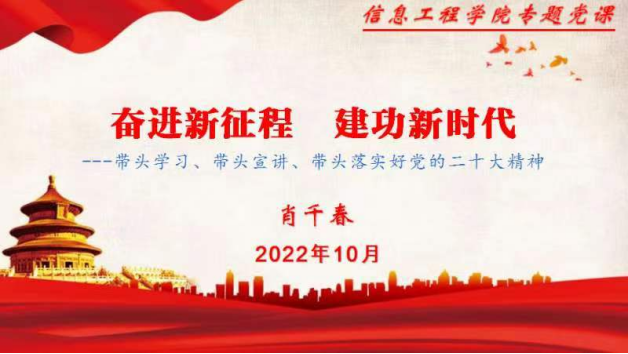 为深入学习贯彻党的二十大精神,深刻领会、准确把握党的二十大精神实质和丰富内涵,切实引导全院各党支部、全体党员把思想、认识和行动统一到学习、宣传、贯彻党的二十大精神上来。10月28日下午,信息工程学院在明志楼北206会议室开展党的二十大精神专题党课辅导活动。学院党委书记肖千春以“奋进新征程 建功新时代---带头学习、带头宣讲、带头落实好党的二十大精神”为主题讲授党课。全院各党支部书记、在校党员教师参加。