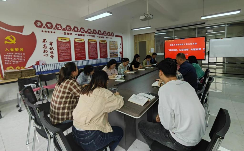 为了强化党员教师的示范引领作用、筑牢纪律规矩意识,提升党性修养、促进党风廉政建设,信息工程学院教工第三党支部于4月19日开展了一场主题为“师表垂范,纪法铸魂”的专题党课。